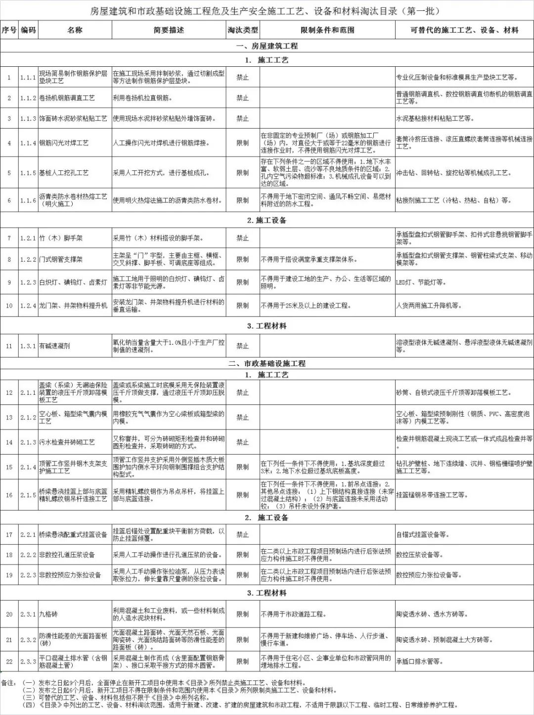 2021年12月14日,住建部印發(fā)的《房屋建筑和市政基礎(chǔ)設(shè)施工程危及生產(chǎn)安全施工工藝、設(shè)備和材料淘汰目錄(第一批)》明確: