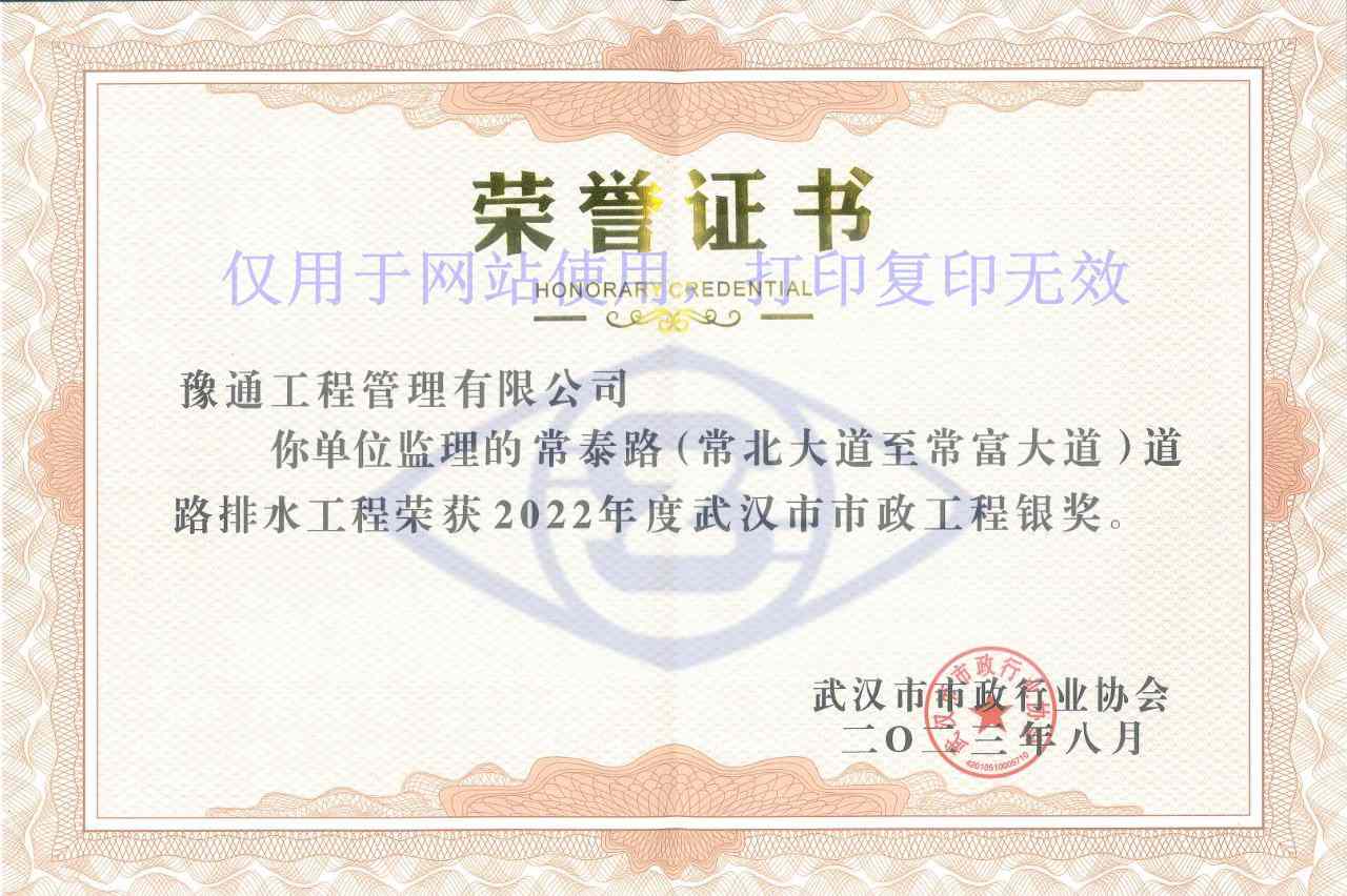 近日,武漢市市政行業(yè)協(xié)會頒發(fā)了2022年度武漢市市政工程獎項,公司監(jiān)理的常泰路(常北大道至常富大道)道路排水工程榜上有名。