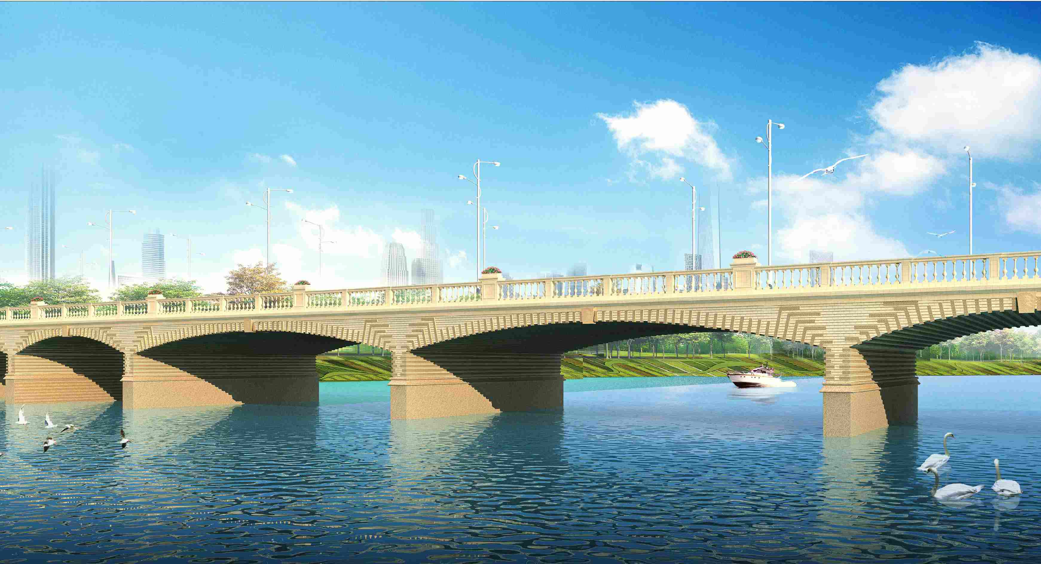 漯河市太白山路沙河橋位于漯河市太白山路沙河橋上,橋南與涇河路相接,橋北與遼河路相連,規(guī)劃為城市主干道,行車速度60KM/h,太白山路橋北引道長360.92m(其中跨濱河路橋為1×20m),南引道長254.92m(其中跨沙南新路橋為1×20m),道路總長度為980m。