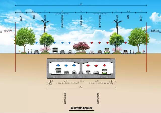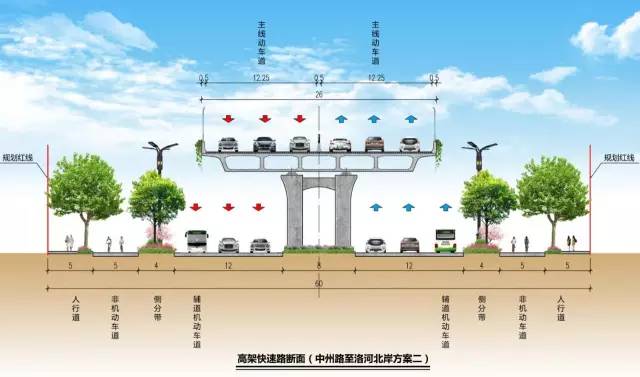王城大道快速路北起連霍高速洛陽站出口,沿現(xiàn)狀路向南,與新310國道、機(jī)場路設(shè)置樞紐型互通立交,跨越規(guī)劃北環(huán)路后,以地道方式連續(xù)下穿老310國道、魏紫路、狀元紅路,與現(xiàn)狀漢宮路即瀍澗大道設(shè)全互通立交,繼續(xù)向南跨越隴海鐵路,進(jìn)入洛陽城市核心區(qū),與紗廠西路設(shè)樞紐型互通立交,之后向南以高架橋的方式穿越現(xiàn)狀洛陽城市核心區(qū),與九都路設(shè)置樞紐型互通立交;繼續(xù)向南跨越洛河橋后,進(jìn)入洛龍新區(qū),與古城路設(shè)置樞紐型互通立交,下穿開源大道、牡丹大道后,上跨關(guān)林路、伊洛路,并與伊洛路設(shè)置互通立交,終點(diǎn)與南環(huán)李屯特大橋銜接。線路全長19km。